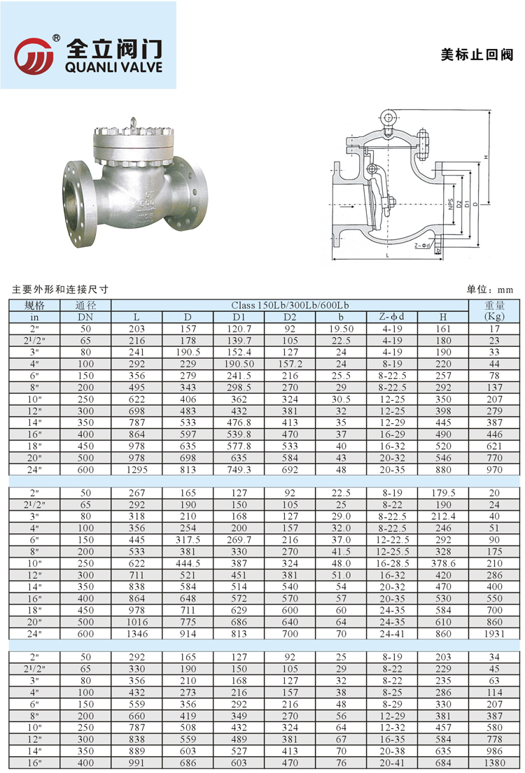 美标止回阀其中内螺纹止回阀,蝶式止回阀就属于这种类型的阀门,它包括旋启式止回阀和升降式止回阀。旋启式止回阀有一介铰链机构,还有一个像门一样的阀瓣自由地靠在倾斜的阀座表面上。为了确保阀瓣每次都能到达阀座面的合适位置,阀瓣设计在铰链机构,以便阀瓣具有足够有旋启空间,并使阀瓣真正的、全面的与阀座接触。阀瓣可以全部用金属制成,也可以在金属上镶嵌皮革、橡胶、或者采用合成覆盖面,这取决于使用性能的要求。旋启式止回阀在完全打开的状况下,流体压力几乎不受阻碍,因此通过阀门的压力降相对较小。升降式止回阀的阀瓣座落位于阀体上阀座密封面上。此阀门除了阀瓣可以自由地升降之外,其余部分如同截止阀一样,流体压力使阀瓣从阀座密封面上抬起,介质回流导致阀瓣回落到阀座上,并切断流动。根据使用条件,阀瓣可以是全金属结构,也可以是在阀瓣架上镶嵌橡胶垫或橡胶环的形式。像截止阀一样,流体通过升降式止回阀的通道也是狭窄的,因此通过升降式止回阀的压力降比旋启式止回阀大些,而且旋启式止回阀的流量受到的限制很少。